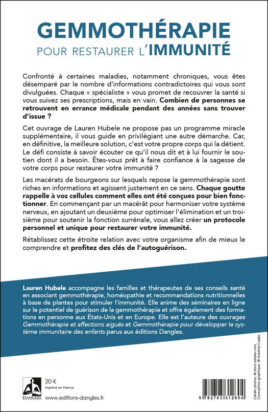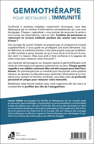 Confronté à certaines maladies, notamment chroniques, vous êtes désemparé par le nombre d’informations contradictoires qui vous sont divulguées. Combien de personnes se retrouvent en errance médicale pendant des années sans trouver d’issue ? Cet ouvrage de Lauren Hubele ne propose pas un programme miracle supplémentaire, il vous guide en privilégiant une autre démarche. Car, en définitive, la meilleure solution, c’est votre propre corps qui la détient. Le défi consiste à savoir écouter ce qu’il nous dit et à lui fournir le soutien dont il a besoin. Êtes-vous prêt à faire confiance à la sagesse de votre corps pour restaurer votre immunité ? Les macérâts de bourgeons sur lesquels repose la gemmothérapie sont riches en informations et agissent justement en ce sens. Chaque goutte rappelle à vos cellules comment elles ont été conçues pour bien fonctionner. Rétablissez cette étroite relation avec votre organisme afin de mieux le comprendre et profitez des clés de l’autoguérison.