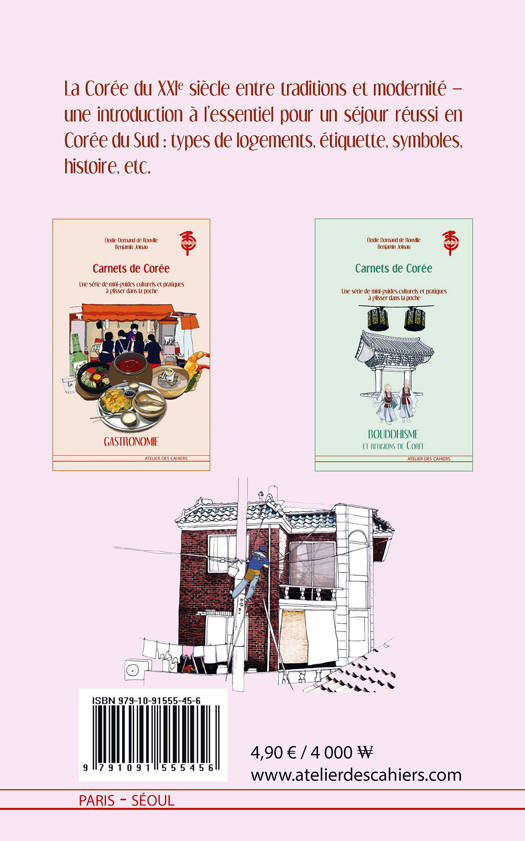 Une série de 3 mini-guides de poche illustrés de la culture coréenne, issue du best-seller, le guide incontournable de la culture coréenne : « Croquis de Corée». Carnets de Corée 1 : généralités. Une introduction à l'essentiel pour un séjour réussi en Corée du Sud : calendrier, types de logements, étiquette, symboles, etc.