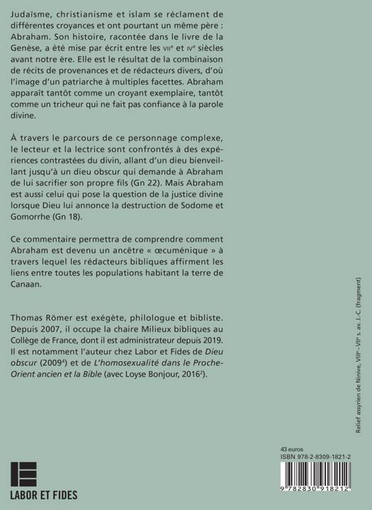 Judaïsme, christianisme et islam se réclament de différents dieux et ont pourtant un même père : Abraham. Son histoire, racontée dans le livre de la Genèse, a été mise par écrit entre les viie et ve siècles avant notre ère. Elle est le résultat de la combinaison de récits de provenances et de rédacteurs divers, d’où l’image d’un patriarche à multiples facettes. Abraham apparaît tantôt comme un croyant exemplaire, tantôt comme un tricheur qui ne fait pas confiance à la parole divine. À travers le parcours de ce personnage complexe, le lecteur est confronté à des expériences contrastées du divin, allant d’un dieu bienveillant jusqu’à un dieu obscur qui demande à Abraham de lui sacrifier son propre fils (Gn 22). Mais Abraham est aussi celui qui pose la question de la justice divine lorsque Dieu lui annonce la destruction de Sodome et Gomorrhe (Gn 18). Ce commentaire permettra de comprendre comment Abraham est devenu un ancêtre «œcuménique»à travers lequel les rédacteurs bibliques affirment les liens entre toutes les populations habitant la terre de Canaan.