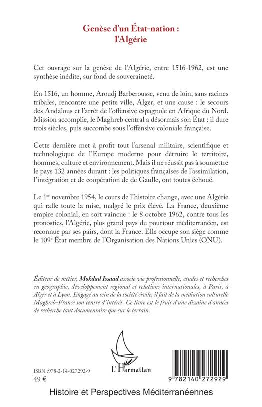 Cet ouvrage sur la genèse de l'Algérie, entre 1516-1962, est une synthèse inédite, sur fond de souveraineté. En 1516, un homme, Aroudj Barberousse, venu de loin, sans racines tribales, rencontre une petite ville, Alger, et une cause: le secours des Andalous et l'arrêt de l'offensive espagnole en Afrique du Nord. Mission accomplie, le Maghreb central a désormais son État: il dure trois siècles, puis succombe sous l'offensive coloniale française. Cette dernière met à profit tout l'arsenal militaire, scientifique et technologique de l'Europe moderne pour détruire le territoire, hommes, culture et environnement. Mais elle ne réussit pas à soumettre le pays 132 années durant: les politiques françaises de l'assimilation, l'intégration et de coopération de de Gaulle, ont toutes échoué. Le 1er novembre 1954, le cours de l'histoire change, avec une Algérie qui rafle toute la mise, malgré le prix élevé. La France, deuxième empire colonial, en sort vaincue: le 8 octobre 1962, contre tous les pronostics, l'Algérie, plus grand pays du pourtour méditerranéen, est reconnue par ses pairs, dont la France. Elle occupe son siège comme le 109e État membre de l'Organisation des Nations Unies (ONU).