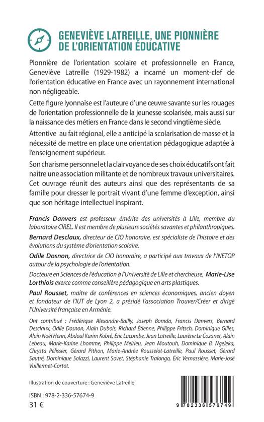 Pionnière de l'orientation scolaire et professionnelle en France, Geneviève Latreille (1929-1982) a incarné un moment-clef de l'orientation éducative en France avec un rayonnement international non négligeable. Cette figure lyonnaise est l'auteure d'une oeuvre savante sur les rouages de l'orientation professionnelle de la jeunesse scolarisée, mais aussi sur la naissance des métiers en France dans le second vingtième siècle. Attentive au fait régional, elle a anticipé la scolarisation de masse et la nécessité de mettre en place une orientation pédagogique adaptée à l'enseignement supérieur. Son charisme personnel et la clairvoyance de ses choix éducatifs ont fait naître une association militante et de nombreux travaux universitaires. Cet ouvrage réunit des auteurs ainsi que des représentants de sa famille pour dresser le portrait vivant d'une femme d'exception, ainsi que son héritage intellectuel inspirant.
