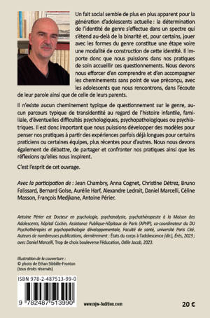 Un fait social semble de plus en plus apparent pour lagénération d’adolescents actuelle : la détermination de l’identité de genre s’effectue dans un spectre qui s’étend au-delà de la binarité et, pour certains, jouer avec les formes du genre constitue une étape voire une modalité de construction de cette identité. Il importe donc que nous puissions dans nos pratiquesde soin accueillir ces questionnements. Nous devons nous efforcer d’en comprendre et d’en accompagner les cheminements sans point de vue préconçu, avecles adolescents que nous rencontrons, dans l’écoutede leur parole ainsi que de celle de leurs parents.Il n’existe aucun cheminement typique de questionnement sur le genre, aucun parcours typique de transidentité au regard de l’histoire infantile, familiale, d’éventuelles difficultés psychologiques, psychopathologiques ou psychiatriques.Il est donc important que nous puissions développer des modèles pour penser nos pratiques à partir des expériences parfois déjà longues pour certains praticiens ou certaines équipes, plus récentes pour d’autres. Nous nous devonségalement de débattre, de partager et confronter nos pratiques ainsi que les réflexions qu’elles nous inspirent.