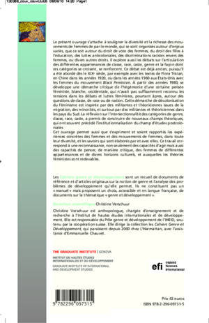 Le présent ouvrage s'attache à souligner la diversité et la richesse des mouvements de femmes de par le monde, qui se sont organisés autour d'enjeux variés, que ce soit autour du droit de vote des femmes, du droit des filles à l'éducation, des luttes anticoloniales, des discriminations racistes envers des femmes, ou divers autres droits. Il explore les débats sur l'articulation des différentes appartenances de classe, race, genre et la façon dont ces catégories se croisent, se renforcent.