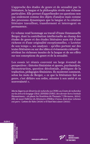Les essais ici réunis couvrent un large éventail de perspectives : théories féministes et queers, psychanalyse, déconstruction, question décoloniale, politiques de la traduction, pédagogies féministes. Ils montrent comment, selon les mots de Anne Emmanuelle Berger, « ce que la littérature fait au genre, c'est défaire son ordre, attenter à son unité et sa souveraineté ».