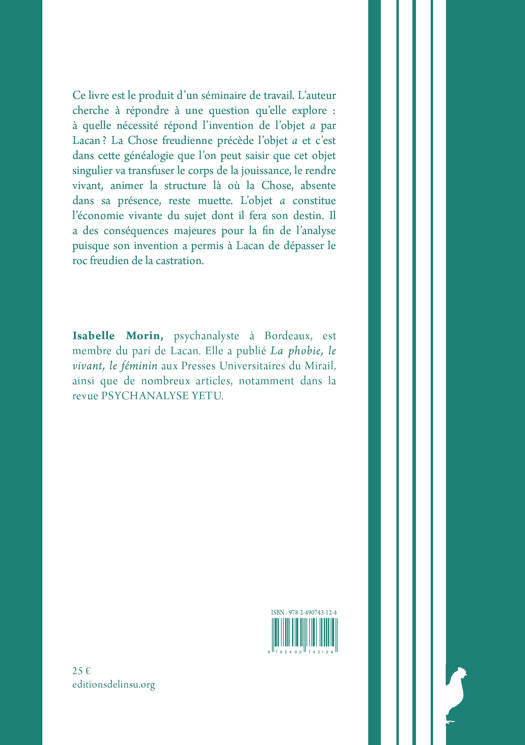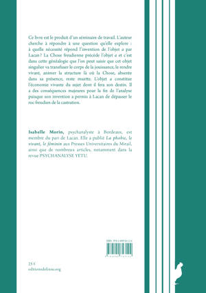 Dans ce livre, produit d’un séminaire tenu en 2020-2021, l’auteur poursuit sa recherche sur l’articulation de la Chose et de l’objet (a), avec l’hypothèse que l’invention par Lacan de cet objet répond à une nécessité pour dépasser le roc de la castration et ouvrir ainsi vers une autre fin de l’analyse. En gardant le fil de la constitution du sujet, Isabelle Morin revient sur les textes de Freud qu’elle croise avec ceux de Lacan et construit peu à peu, pas à pas, un parcours qui va de la différenciation de la Chose et de l’objet (a) à la mise en fonction de l’objet dans sa double valence, objet cause du désir et objet plus-de-jouir comme ce qui animer la structure du sujet, l’inscrit du côté du vivant.