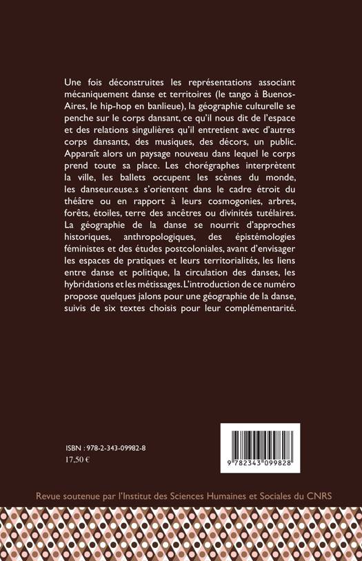 Une fois déconstruites les représentations associant mécaniquement danse et territoires, la géographie culturelle se penche sur le corps dansant, ce qu'il nous dit de l'espace et des relations singulières qu'il entretient avec d'autres corps dansants, des musiques, des décors, un public. La géographie de la danse se nourrit d'approches historiques, anthropologiques, des épistémologies féministes et des études postcoloniales, mais aussi des espaces de pratique, des liens entre danse et politique, de la circulation des danses, des hybridations et des métissages.