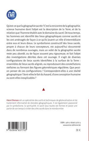 De tout temps, les hommes ont identifié des lieux géographiques comme sacrés, ont sacralisé des lieux et les ont aménagés de façon à ce qu'ils jouent un rôle d'intermédiaire entre le monde terrestre et leurs dieux. Aujourd'hui, certains ensembles de lieux sacrés semblent former des ensembles organisés : alignements, constellations, figures géographiques : est-ce le fait du hasard, de la conception humaine ou d'une autre origine ? L'ouvrage propose des éléments de réponse à ces questions.