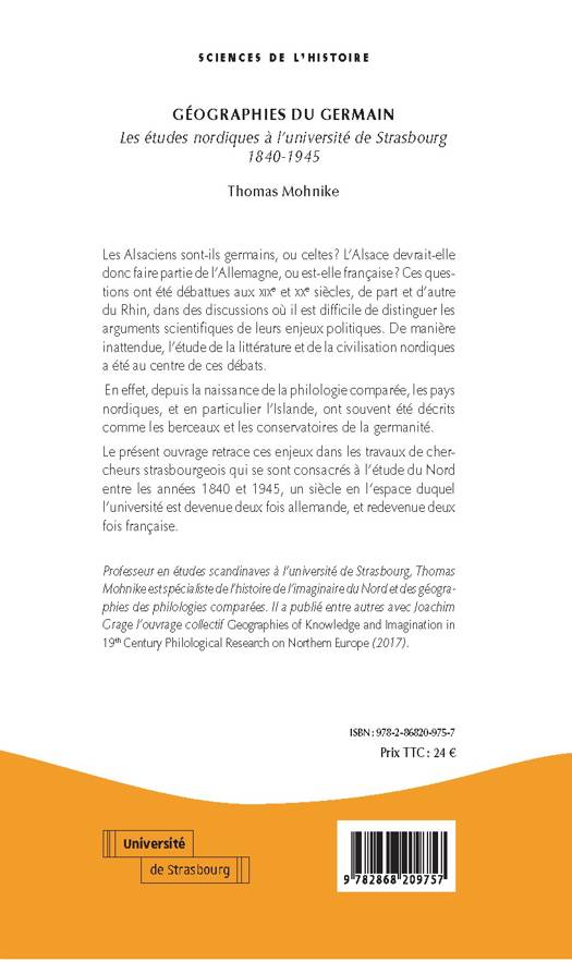 Les Alsaciens sont-ils germains, ou celtes ? L'Alsace devrait-elle donc faire partie de l'Allemagne, ou est-elle française ? Ces questions ont été débattues aux XIXe et XXe siècles, de part et d'autre du Rhin, dans des discussions où il est difficile de distinguer les arguments scientifiques de leurs enjeux politiques. De manière inattendue, l'étude de la littérature et de la civilisation nordiques a été au centre de ces débats.