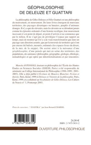 La philosophie de Gilles Deleuze et Félix Guattari est une philosophie du mouvement, en mouvement. De leurs livres émergent de nouveaux territoires, des paysages désertiques ou lunaires, peuplés d'animaux étranges. On assiste ainsi à la naissance d'une géophilosophie, d'une pensée qui met en scène des territoires, des populations, des animaux (philosophie, géographie, éthologie, nomadologie) et qui opère par déterritorialisations et par rencontres.