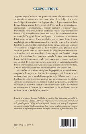 La géopolitique s'intéresse à la politique attachée au territoire et aux enjeux qui en découlent. Cet ouvrage traite des questions de la population, du gouvernement et de la souveraineté de l'Etat. Au carrefour de ces disciplines, la géopolitique s'intéresse aux frontières maritimes entre Etats côtiers et aux ressources naturelles du territoire. Ce sujet sensible exacerbe de nombreuses rivalités bien que la mondialisation puisse créer l'illusion du contraire.
