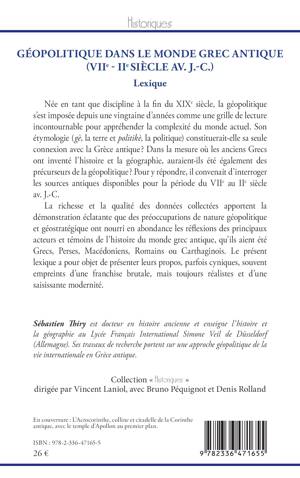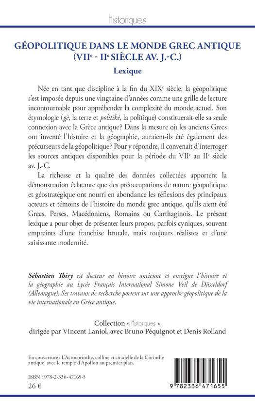 Née en tant que discipline à la fin du XIXe siècle, la géopolitique s’est imposée depuis une vingtaine d’années comme une grille de lecture incontournable pour appréhender la complexité du monde actuel. Son étymologie (gè, la terre et politikè, la politique) constituerait-elle sa seule connexion avec la Grèce antique ? Dans la mesure où les anciens Grecs ont inventé l’histoire et la géographie, auraient-ils été également des précurseurs de la géopolitique ? Pour y répondre, il convenait d’interroger les sources antiques disponibles pour la période du VIIe au IIe siècle av. J.-C. La richesse et la qualité des données collectées apportent la démonstration éclatante que des préoccupations de nature géopolitique et géostratégique ont nourri en abondance les réflexions des principaux acteurs et témoins de l’histoire du monde grec antique, qu’ils aient été Grecs, Perses, Macédoniens, Romains ou Carthaginois. Le présent lexique a pour objet de présenter leurs propos, parfois cyniques, souvent empreints d’une franchise brutale, mais toujours réalistes et d’une saisissante modernité.