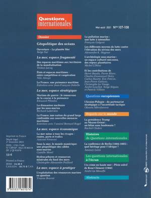 Les espaces maritimes sont au coeur de la mondialisation et de la compétition stratégique entre États pour trois raisons principales: économiques, démographiques (65 % de la population mondiale vit dans des zones portuaires et côtières) et géopolitiques (détroits, canaux et nombre d'îles représentent des enjeux au point de susciter des tensions entre certains pays). Ce numéro de Questions internationales met en lumière, à l’aide d’exemples précis, l’unité des problèmes internationaux soulevés par des espaces maritimes fragmentés et l’universalité des principes qui s’y appliquent.