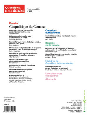 Depuis le conflit du Haut-Karabakh entre l’Arménie et l’Azerbaïdjan en 2023, le Caucase attire à nouveau l’attention internationale en raison de son rôle dans les tensions entre l’Occident et la Russie, de ses conflits non résolus et de son importance en tant que corridor énergétique vers l’Europe. Ce dossier de Questions internationales propose une analyse approfondie des enjeux géopolitiques de la région. Il décrypte l'évolution politique, économique et sociale récente des trois « jeunes » États qui la composent (Arménie, Azerbaïdjan et Géorgie). Leurs relations complexes avec la Russie, ancienne puissance colonisatrice et allié imprévisible, ainsi qu'avec la Turquie aux ambitions grandissantes sont également étudiées. Des éclairages consacrés aux nombreuses minorités et langues du Caucase, à ses territoires sécessionnistes (Ossétie du Sud, Abkhazie) et à l'influence du facteur religieux enrichissent ce numéro très complet.