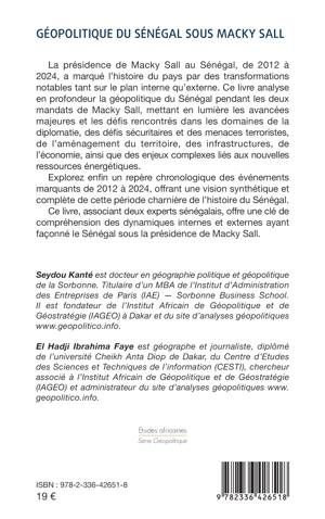 La présidence de Macky Sall au Sénégal, qui s’étend de 2012 à 2024, a été une période marquante de l’histoire du pays, caractérisée par des transformations significatives tant sur le plan interne qu’externe. Ce livre analyse en profondeur la géopolitique du Sénégal durant les deux mandats de Macky Sall, en mettant en lumière les principales avancées et les défis rencontrés dans les domaines de la diplomatie, des défis sécuritaires et des menaces terroristes, de l’aménagement du territoire, des infrastructures, de l’économie ainsi que les enjeux complexes liés aux nouvelles ressources énergétiques.