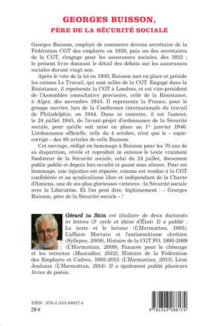 Georges Buisson, employé de commerce devenu secrétaire de la Fédération CGT des employés de 1920, puis un des secrétaires de la CGT, s'engage pour les assurances sociales dès 1922. Cet ouvrage, lui rend hommage pour les 70 ans de sa disparition. Il révèle et reproduit in extenso le texte fondateur de la sécurité sociale du 24 juillet 1945, depuis lors occulté et passé sous silence. Pour cet hommage, une injustice est réparée, comme est rendue à la CGT confédérée et au syndicalisme libre et indépendant, une de ses plus glorieuses victoires : la Sécurité sociale avec la Libération. Et l'on peut dire légitimement : « Georges Buisson, père de la Sécurité sociale » !