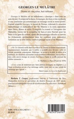 Georges le Mulâtre est un mélodrame « classique » dans tous les sens du mot. Il comprend la danse, la musique, des bons et des méchants et une conclusion qui communique un message social et moral positif. Garand simplifie Georges, le roman de Dumas, réduisant le caractère multiethnique et multiculturel de l’île Maurice à la seule opposition entre Noirs, Blancs et métis. Il magnifie la cruauté et l’arrogance des Malmédie, insiste sur la sympathie de Sara et miss Harriett pour les Noirs et les gens de couleur, ajoute des personnages ridicules et renvoie les événements spectaculaires dans les coulisses pour concentrer l’attention sur la lutte intime contre le préjugé racial à l’île Maurice.