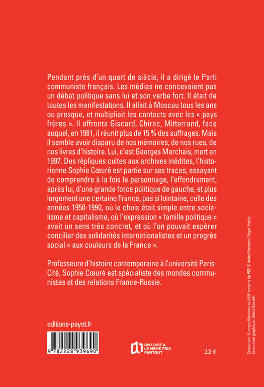 Pendant près d'un quart de siècle, il a dirigé le Parti communiste français. Les médias ne concevaient pas un débat politique sans lui et son verbe fort. Il était de toutes les manifestations. Il allait à Moscou tous les ans ou presque, et multipliait les contacts avec les "pays frères". Il affronta Giscard, Chirac, Mitterrand, face auquel, en 1981, il réunit plus de 15 % des suffrages. Mais il semble avoir disparu de nos mémoires, de nos rues, de nos livres d'histoire. Lui, c'est Georges Marchais, mort en 1997. Des répliques cultes aux archives inédites, l'historienne Sophie Coeuré est partie sur ses traces, essayant de comprendre à la fois le personnage, l'effondrement, après lui, d'une grande force politique de gauche, et plus largement une certaine France, pas si lointaine, celle des années 1950-1990, où le choix était simple entre socialisme et capitalisme, où l'expression "famille politique" avait un sens très concret, et où l'on pouvait espérer concilier des solidarités internationalistes et un progrès social "aux couleurs de la France".