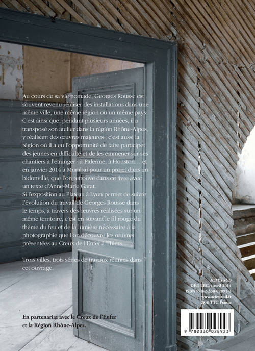 Au cours de sa vie nomade, Georges Rousse est souvent revenu réaliser des installations dans une même ville, une même région ou un même pays. C'est ainsi que, pendant plusieurs années, il a transposé son atelier dans la région Rhône-Alpes, y réalisant des oeuvres majeures ; c'est aussi la région où il a eu l'opportunité de faire participer des jeunes en difficulté et de les emmener sur ses chantiers à l'étranger : à Palerme, à Houston... et en janvier 2014 à Mumbai pour un projet dans un bidonville, que l'on retrouve dans ce livre avec un texte d'Anne-Marie Garat.