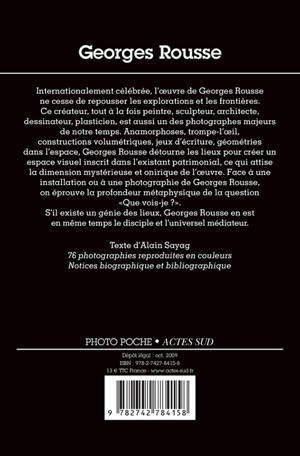 Internationalement célébrée, l'oeuvre de Georges Rousse ne cesse de repousser les explorations et les frontières. Ce créateur, tout à la fois peintre, sculpteur, architecte, dessinateur, plasticien, est aussi un des photographes majeurs de notre temps. Anamorphoses, trompe-l'oeil, constructions volumétriques, jeux d'écriture, géométries dans l'espace. Georges Rousse détourne les lieux pour créer un espace visuel inscrit dans l'existant patrimonial, ce qui attise la dimension mystérieuse et onirique de l'oeuvre. Face à une installation ou à une photographie de Georges Rousse, on éprouve la profondeur métaphysique de la question « Que vois-je ? ». S'il existe un génie des lieux, Georges Rousse en est en même temps le disciple et l'universel médiateur.