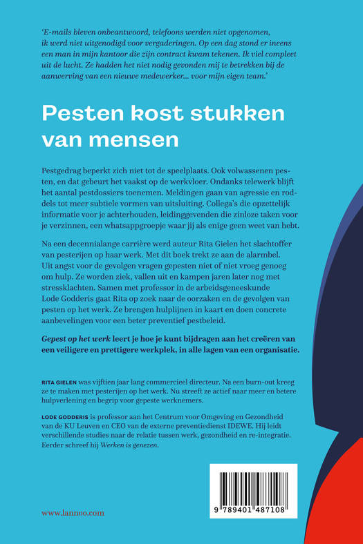 'E-mails bleven onbeantwoord, telefoons werden niet opgenomen, ik werd niet uitgenodigd voor vergaderingen. Op een dag stond er ineens een man in mijn kantoor die zijn contract kwam tekenen. Ik viel compleet uit de lucht. Ze hadden het niet nodig gevonden mij te betrekken bij de aanwerving van een nieuwe medewerker… voor mijn eigen team.' Pestgedrag beperkt zich niet tot de speelplaats. Ook volwassenen pesten, en dat gebeurt het vaakst op de werkvloer. Ondanks telewerk blijft het aantal pestdossiers toenemen. Meldingen gaan van agressie en roddels tot meer subtiele vormen van uitsluiting. Collega's die opzettelijk informatie voor je achterhouden, leidinggevenden die zinloze taken voor je verzinnen, een whatsappgroepje waar jij als enige geen weet van hebt. Na een decennialange carrière werd auteur Rita Gielen het slachtoffer van pesterijen op haar werk. Met dit boek trekt ze aan de alarmbel. Uit angst voor de gevolgen vragen gepesten niet of niet vroeg genoeg om hulp. Ze worden ziek, vallen uit en kampen jaren later nog met stressklachten. Samen met professor in de arbeidsgeneeskunde Lode Godderis gaat Rita op zoek naar de oorzaken en de gevolgen van pesten op het werk. Ze brengen hulplijnen in kaart en doen concrete aanbevelingen voor een beter preventief pestbeleid.