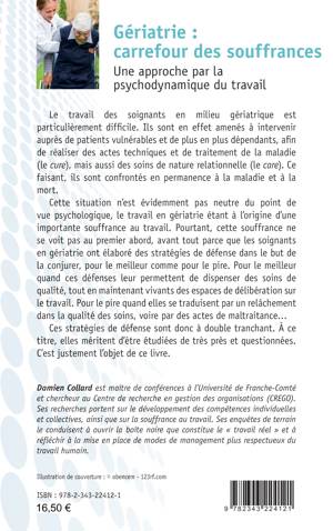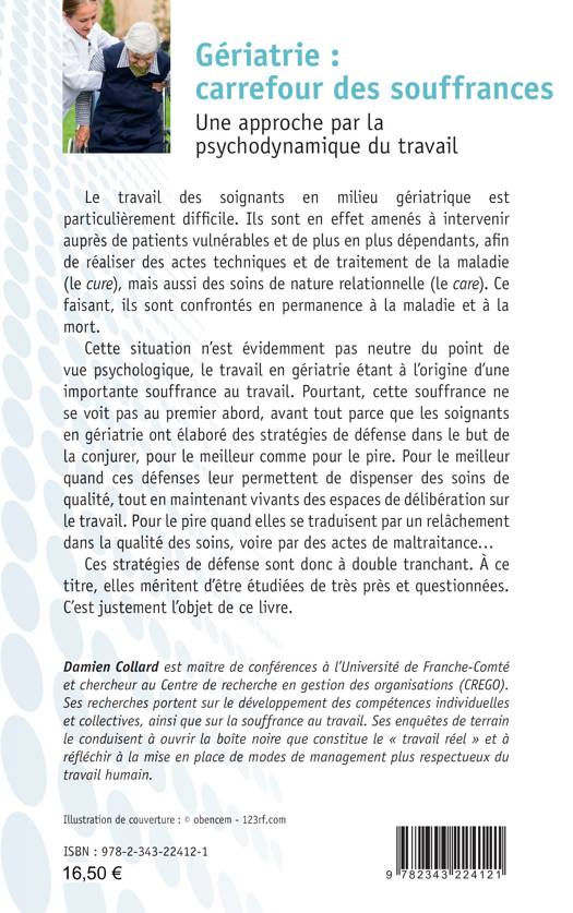 mort. Cette situation n’est évidemment pas neutre du point de vue psychologique, le travail en gériatrie étant à l’origine d’une importante souffrance au travail. Pourtant, cette souffrance ne se voit pas au premier abord, avant tout parce que les soignants en gériatrie ont élaboré des stratégies de défense dans le but de la conjurer, pour le meilleur comme pour le pire.