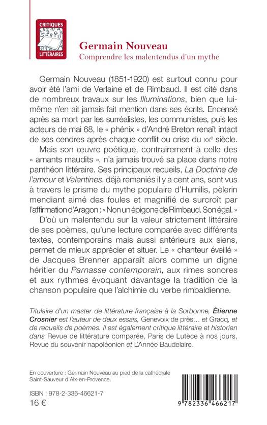 Germain Nouveau (1851-1920) est surtout connu pour avoir été l'ami de Verlaine et de Rimbaud. Il est cité dans de nombreux travaux sur les Illuminations, bien que lui-même n'en ait jamais fait mention dans ses écrits. Encensé après sa mort par les surréalistes, les communistes, puis les acteurs de mai 68, le phénix d'André Breton renaît intact de ses cendres après chaque conflit ou crise du XXe siècle. Mais son oeuvre poétique, contrairement à celle des amants maudits, n'a jamais trouvé sa place dans notre Panthéon littéraire. Ses principaux recueils, La Doctrine de l'amour et Valentines, déjà remaniés il y a cent ans, sont de surcroît éclipsés par le mythe populaire d'Humilis, pèlerin mendiant sublimé par l'affirmation d'Aragon Non un épigone de Rimbaud. Son égal. D'où un malentendu sur la valeur strictement littéraire de ses poèmes, qu'une relecture comparée avec différents textes, contemporains mais aussi antérieurs, permet de mieux situer. Le chanteur éveillé de Jacques Brenner apparaît alors comme un digne héritier du Parnasse contemporain, aux rimes sonores et aux rythmes évoquant davantage la tradition de la chanson populaire que l'alchimie du verbe rimbaldienne.