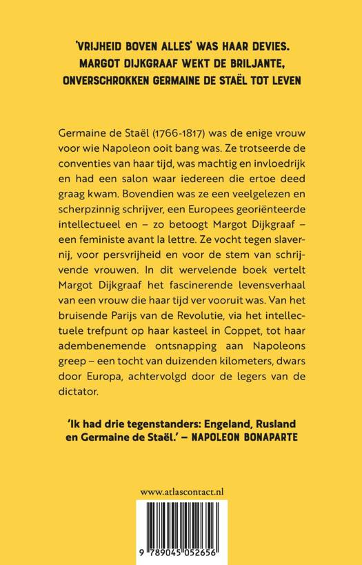 Vrijheid boven alles was haar devies. Margot Dijkgraaf wekt de briljante, onverschrokken Germaine de Staël tot leven Germaine de Staël (1766-1817) was de enige vrouw voor wie Napoleon ooit bang was. Ze trotseerde de conventies van haar tijd, was machtig en invloedrijk en had een salon waar iedereen die ertoe deed graag kwam. Bovendien was ze een veelgelezen en scherpzinnig schrijver, een Europees georiënteerde intellectueel en – zo betoogt Margot Dijkgraaf – een feministe avant la lettre. Ze vocht tegen slavernij, voor persvrijheid en voor de stem van schrijvende vrouwen. In dit wervelende boek vertelt Margot Dijkgraaf het fascinerende levensverhaal van een vrouw die haar tijd ver vooruit was. Van het bruisende Parijs van de Revolutie, via het intellectuele trefpunt op haar kasteel in Coppet, tot haar adembenemende ontsnapping aan Napoleons greep – een tocht van duizenden kilometers, dwars door Europa, achtervolgd door de legers van de dictator. 'Ik had drie tegenstanders: Engeland, Rusland en Germaine de Staël.' – Napoleon Bonaparte