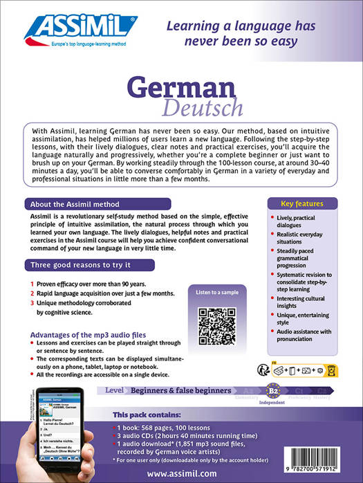 Source language: FRENCHStudied language: SPANISHHere is the all-new edition of our German method, one of the most popular courses in our catalogue. Structural evolution in the language and the apparition of new terms and turns of phrase made this German method necessary. It also takes Austrian idiom into account. By working conscientiously and regularly, you will learn everyday vocabulary in a matter of months, as well as the basic grammar rules underpinning the language. Very soon, this beautiful language will sound familiar to you, thanks to around 100 dialogues from everyday life presented in this box work. Available in this box set with 3 audio CD and 1 MP3 audio download. The recordings include all the texts in German for each lesson and the translation exercises from the book. These progressively more challenging texts have been recorded by professional native speakers. Specifications - 1 book + 3 audio CDs + Downloadable MP3 files Key points - Lively, useful dialogue - Carefully-constructed progression - Pronunciation using the recordings