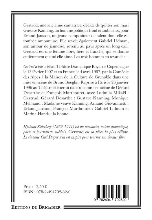 Gertrud a été créé au Théâtre Dramatique Royal de Copenhague le 13 février 1907 et en France, le 4 avril 1987, par la Comédie des Alpes à la Maison de la Culture de Grenoble dans une mise en scène de Bruno Boeglin. Reprise à Paris le 23 janvier 1996 au Théâtre Hébertot dans une mise en scène de Gérard Desarthe et François Marthouret, avec Ludmila Mikaël : Gertrud, Gérard Desarthe : Gustave Kanning, Monique Mélinand : Madame veuve Kanning, Arnaud Giovaninetti : Erland Jansson, François Marthouret : Gabriel Lidman et Marina Hands : la bonne.