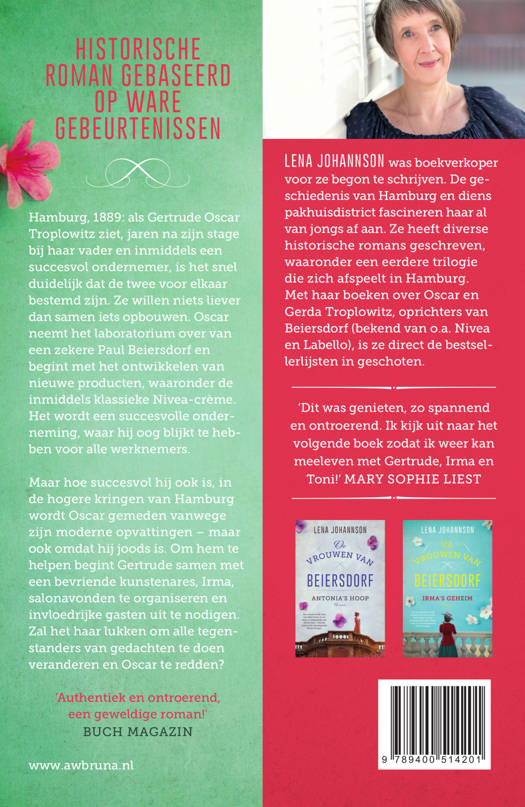 Maar hoe succesvol hij ook is, de hogere kringen in Hamburg mijden Oscar vanwege zijn moderne opvattingen – maar ook omdat hij joods is. Om Oscar te helpen begint Gerda, samen met een bevriende kunstenares, salonavonden te organiseren en invloedrijke gasten uit te nodigen. Zal het haar lukken om alle tegenstanders van gedachten te doen veranderen en Oscars bedrijf te redden? Authentiek en ontroerend: de meeslepende Nivea-trilogie van Lena Johannson is gebaseerd op ware gebeurtenissen.