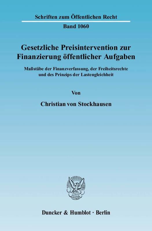 Der Gesetzgeber setzt zunehmend Preisregelungen zur Finanzierung öffentlicher Aufgaben ein. Bei materieller Betrachtung fällt die Wirkungsäquivalenz dieser Regelungen mit Sonderabgaben auf. Die Verfassungsanforderungen an "abgabenähnliche" Zwangsvergütungen ergeben sich unmittelbar aus den Gewährleistungen der Finanzverfassung und der Grundrechte: Die Kompetenzordnung für Steuern und das Budgetbewilligungsrecht wehren Kompetenzübergriffe des preisregulierenden Sachgesetzgebers ab. Die Freiheitsrechte und insbesondere das Prinzip der Lastengleichheit fordern die besondere Rechtfertigung der finanziellen Sonderbelastung Privater für Gemeinwohlzwecke und begrenzen deren zulässige Intensität. Christian von Stockhausen entwickelt diese Maßstäbe am Beispiel der Stromeinspeisungsregelung nach dem Erneuerbare-Energien-Gesetz, des Arzneimittelabschlags gemäß 130a Sozialgesetzbuch V sowie des Arbeitgeberzuschusses zum Mutterschaftsgeld nach 14 Abs. 1 Mutterschutzgesetz.