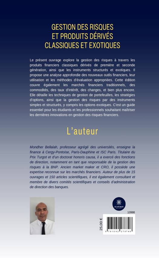 Le présent ouvrage explore la gestion des risques à travers les produits financiers classiques dérivés de première et seconde génération, ainsi que les instruments structurés et exotiques. Il propose une analyse approfondie des nouveaux outils financiers, leur utilisation et les méthodes d'évaluation appropriées. Cette édition couvre également les marchés financiers traditionnels, des commodités, des taux d'intérêt, des changes, et bien plus encore. Elle détaille les techniques de gestion de portefeuilles, les stratégies d'options, ainsi que la gestion des risques par des instruments simples et structurés, y compris les options exotiques. C'est un guide essentiel pour les étudiants et les professionnels souhaitant maîtriser les dernières innovations en gestion des risques financiers.