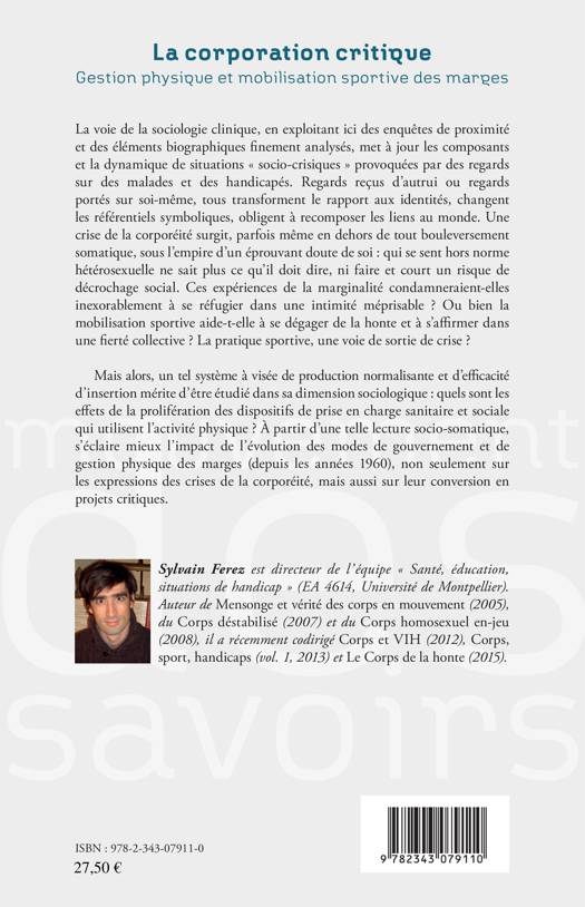 A partir de l'étude des crises du corps et de leur gestion individuelle et collective, Sylvain Ferez propose une analyse croisée des enjeux des mobilisations sportives des groupes « minoritaires » et de la prolifération des dispositifs de prise en charge sanitaire et sociale par l'activité physique. La transformation des usages sociaux et politiques des activités physiques et sportives depuis les années 1960 éclaire ainsi l'évolution des modes de gouvernement des populations et de gestion (physique) des marges.