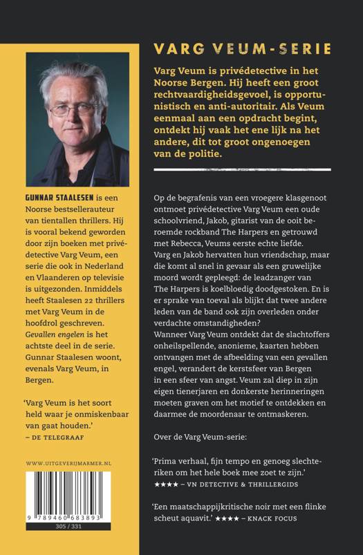 Varg Veum is privédetective in het Noorse Bergen. Hij heeft een groot rechtvaardigheidsgevoel, is opportunistisch en anti-autoritair. Als Veum eenmaal aan een opdracht begint, ontdekt hij vaak het ene lijk na het andere, dit tot groot ongenoegen van de politie. Op de begrafenis van een vroegere klasgenoot ontmoet privédetective Varg Veum een oude schoolvriend, Jakob, gitarist van de ooit beroemde rockband The Harpers en getrouwd met Rebecca, Veums eerste echte liefde. Varg en Jakob hervatten hun vriendschap, maar die komt al snel in gevaar als een gruwelijke moord wordt gepleegd: de leadzanger van The Harpers is koelbloedig doodgestoken. En is er sprake van toeval als blijkt dat twee andere leden van de band ook zijn overleden onder verdachte omstandigheden? Wanneer Varg Veum ontdekt dat de slachtoffers onheilspellende, anonieme, kaarten hebben ontvangen met de afbeelding van een gevallen engel, verandert de kerstsfeer van Bergen in een sfeer van angst. Veum zal diep in zijn eigen tienerjaren en donkerste herinneringen moeten graven om het motief te ontdekken en daarmee de moordenaar te ontmaskeren. Over de Varg Veum-serie: ‘Prima verhaal, fijn tempo en genoeg slechteriken om het hele boek mee zoet te zijn.’ **** – VN Detective & thrillergids ‘Een maatschappijkritische noir met een flinke scheut aquavit.’ **** – Knack Focus ‘Varg Veum is het soort held waar je onmiskenbaar van gaat houden.’ – De Telegraaf