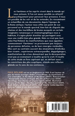 Les fantômes et les esprits nous côtoient. Si l'on est assez sensibles – ou attentifs psychiquement – pour percevoir leur présence, il nous est possible de les voir et de les entendre. En réexaminant un échantillon de cas documentés depuis la Rome antique, l'auteur nous offre son point de vue sur le monde spectral : bien loin du cliquetis des chaînes et des tourbillons de brume auxquels un certain imaginaire romanesque et cinématographique nous a habitués. Il s'agit plutôt d'entités qui partagent avec nous une réalité qui nous dépasse. De plus, selon Roland, les manifestations que nous résumons d'ordinaire sous le terme de « fantômes » ne proviennent pas toujours de personnes défuntes, ou de leurs résidus d'énergie, elles sont plutôt des émanations d'individus bien vivants : expériences extra-corporelles, Doppelgängers ; « sortir de son propre corps » n'est pas un événement si rare qu'on le pense. Il résulte de cette étude un livre captivant qui, en défiant aussi les convictions des plus sceptiques, stimule une réflexion globale sur le sens de nos existences.