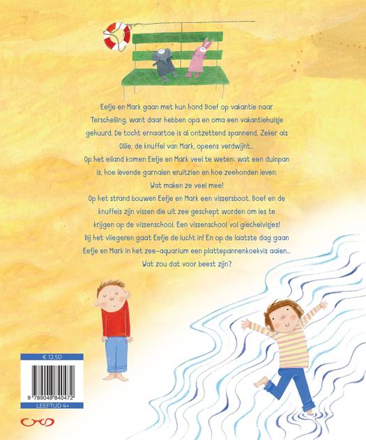 Op het eiland komen Mark en Eefje veel te weten: wat een duinpan is, hoe levende garnalen eruitzien en hoe zeehonden leven. Wat maken ze veel mee! Op het strand bouwen Mark en Eefje een vissersboot. Boef en de knuffels zijn vissen die uit zee geschept worden om les te krijgen op de vissenschool. Een vissenschool vol giechelvisjes! Bij het vliegeren gaat Eefje de lucht in! En op de laatste dag gaan Mark en Eefje in het zee-aquarium een plattepannenkoekenvis aaien... Wat zou dat voor beest zijn?