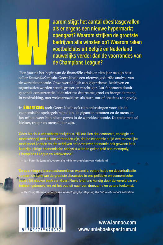 Waarom stijgt het aantal obesitasgevallen als er ergens een nieuwe hypermarkt opengaat? Waarom strijken de grootste bedrijven alle winsten op? Waarom raken voetbalclubs uit België en Nederland nauwelijks verder dan de voorrondes van de Champions League? Tien jaar na het begin van de financiële crisis en tien jaar na zijn bestseller Econoshock maakt Geert Noels een nieuwe, gedurfde analyse van de wereldeconomie. Onze wereld lijdt aan gigantisme. Bedrijven en organisaties worden steeds groter en machtiger. Dat fenomeen doodt gezonde concurrentie, leidt niet tot duurzame groei en brengt de mens in verdrukking, met welvaartsziektes als burn-out of obesitas tot gevolg. In Gigantisme stelt Geert Noels ook tien oplossingen voor die de economische spelregels bijstellen, de giganten temmen en de mens en het milieu weer een plaats geven in de wereldeconomie. De toekomst zal kleiner, trager en menselijker zijn.