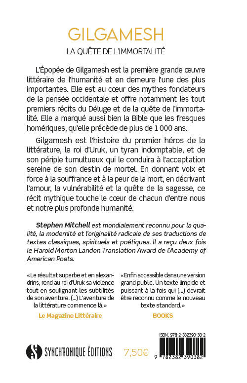 L'épopée de Gilgamesh est la première grande œuvre littéraire connue de l'humanité. Elle est au cœur des mythes fondateurs de la pensée occidentale et, précédant la Bible de plus de 1000 ans, elle offre notamment le tout premier récit du déluge. Gilgamesh est l'histoire d'un tyran indomptable et de son périple tumultueux vers l'acceptation sereine de son destin de mortel. En donnant voix et force à la souffrance et à la peur de la mort, en décrivant l'amour, la vulnérabilité et la quête de la sagesse, ce récit mythique touche le coeur de chacun d'entre nous et notre plus profonde humanité. Stephen Mitchell restitue le souffle épique et la profondeur philosophique de cete épopée dans une langue à la fois fraîche, moderne et puissante.