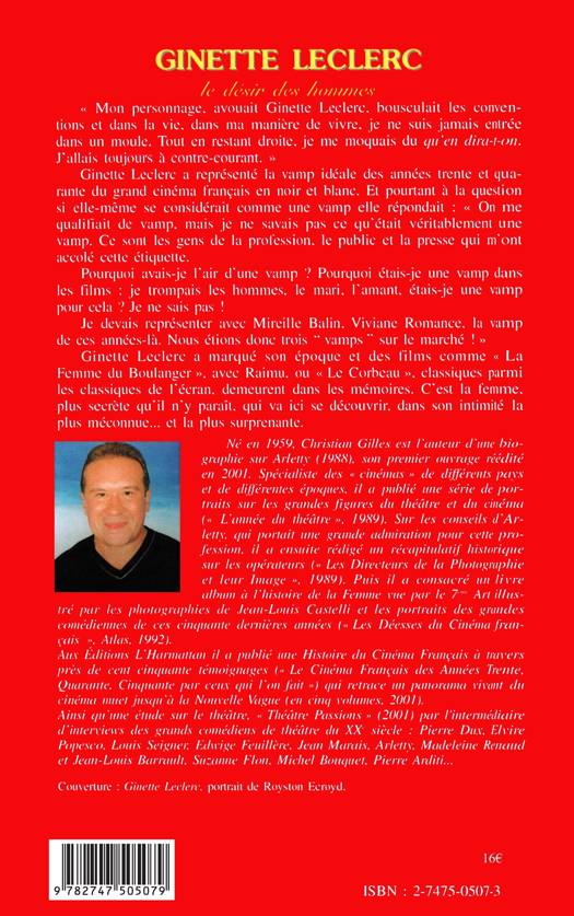 Ginette Leclerc a représenté la vamp idéale des années trente et quarante du grand cinéma français en noir et blanc. Considérée comme une vamp, elle a marqué son époque et des films comme " La Femme du Boulanger " avec Raimu, ou " Le Corbeau ". C'est la femme, plus secrète qu'il n'y paraît, qui va ici se découvrir, dans son intimité la plus méconnue… et la plus surprenante.