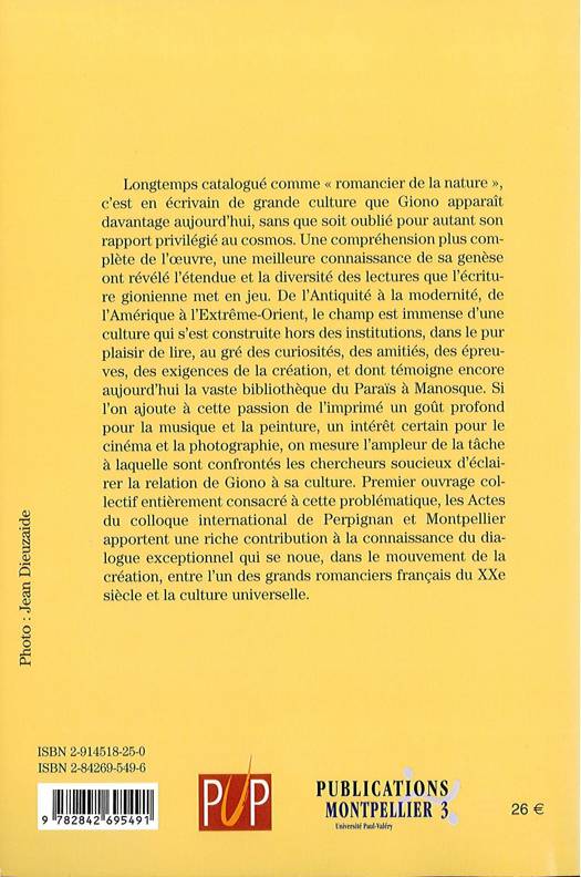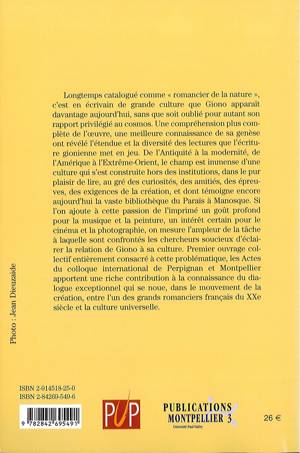Longtemps catalogué comme « romancier de la nature », c’est en écrivain de grande culture que Giono apparaît davantage aujourd’hui : littératures de toutes époques et de tous pays, mais aussi musique, peinture, cinéma, photographie, il va partout où le mènent sa curiosité et son plaisir. C’est à la connaissance de ce dialogue exceptionnel entre un romancier et la culture universelle que le colloque de Perpignan et Montpellier, réunissant les meilleurs spécialistes de l’œuvre, a apporté une riche contribution.