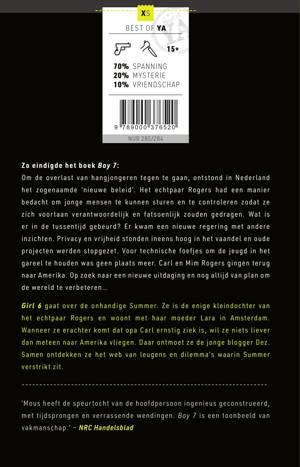 Girl 6 is onderdeel van de Best of YA | XS-reeks. Meer lezen uit deze reeks? Lees ook: • Esther Walraven – Voor Yasmin • Danielle Bakhuis – De laatste uren van Josephine Donkers • Buddy Tegenbosch – Mijn nacht met Vedder • Saskia Mouissie – De belofte • Mijke Pelgrim – Over straatfiguren en wegpiraten • Henk Hardeman – Wat gebeurde er met David? • Mirjam Mous – Welkom in Smartpark • Esther Walraven – Wind