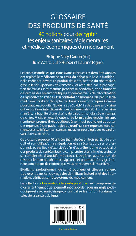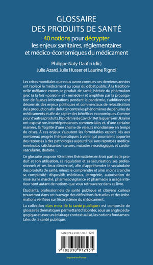 Les crises mondiales que nous avons connues ces dernières années ont replacé le médicament au coeur du débat public. À la traditionnelle méfiance envers ce produit de santé, héritée du phármakon grec (à la fois « poison » et « remède ») et amplifiée par la propagation de fausses informations pendant la pandémie, s’additionnent désormais des enjeux politiques et commerciaux de relocalisation de la production afin de lutter contre les phénomènes de pénuries de médicaments et afin de capter des bénéfices économiques. Comme pour d’autres produits, l’épidémie de Covid‑19 et la guerre en Ukraine ont exposé nos interdépendances commerciales et, d’une certaine manière, la fragilité d’une chaîne de valeurs mondialisée en temps de crises. À ces enjeux s’ajoutent les formidables espoirs liés aux nombreux progrès thérapeutiques à venir qui pourraient apporter des réponses à des pathologies aujourd’hui sans réponses médicamenteuses satisfaisantes : cancers, maladies neurologiques et cardiovasculaires, diabète… Ce glossaire propose 40 entrées thématisées en trois parties (le produit et son utilisation, sa régulation et sa sécurisation, ses professionnels et ses lieux d’exercice), afin d’appréhender le vocabulaire des produits de santé, mieux le comprendre et ainsi moins craindre sa complexité : dispositifs médicaux, iatrogénie, autorisation de mise sur le marché, pharmacovigilance et pharmacie à usage intérieur sont autant de notions que vous retrouverez dans ce livre. Étudiants, professionnels de santé publique et citoyens curieux trouveront dans cet ouvrage des définitions factuelles et des informations vérifiées sur l’écosystème du médicament. La collection « Les mots de la santé publique » est composée de glossaires thématiques permettant d’aborder, sous un angle pédagogique et avec un éclairage contextualisé, les notions fondamentales de la santé publique.