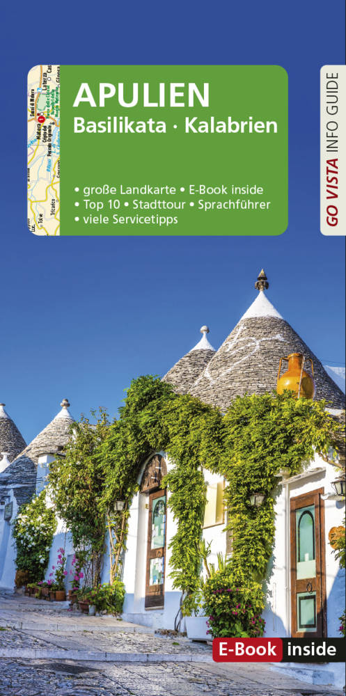 Über die Reiseziele Apulien, Basilikata, KalabrienSporn, Absatz und Spitze des italienischen Stiefels - das sind vielleicht die besten Teile der Apenninen-Halbinsel. Süditaliens Regionen Apulien, Basilikata und Kalabrien stecken voller Überraschungen und bieten alle Voraussetzungen für einen glücklichen Urlaub mit der ganzen Familie.Ein mildes Mittelmeerklima und insgesamt 1600 Kilometer abwechslungsreiche Küste lassen kaum Ferienwünsche offen. Die landschaftliche Vielfalt im Hinterland reicht von duftenden Macchia-Hügeln, über karstige Hochebenen, tiefe Talschluchten, rauschende Wildflüsse, dichte Wälder und blühende Almfluren bis zu schneebedeckten Gipfeln. Eine weitgehend intakte Natur ist in großen Nationalparks unter Schutz gestellt. Über den Go Vista Info Guide Apulien, Basilikata und KalabrienNach der Chronik, die kurz und prägnant die wichtigsten Daten zur Geschichte liefert, wird die Stadt Matera vorgestellt und danach im Kapitel Vista Points die nachfolgenden Regionen, mit Serviceadressen der Highlights und mit Hinweisen auf Restaurants, Cafés und Einkaufsmöglichkeiten:- Apulien: Norden, Mitte und Süden- Basilikata: Norden, Südosten und Südwesten- Kalabrien: Nordwesten, Nordosten und SüdenDer Inhalt des Reiseführers kurz und knapp:- Top 10 des Reiseziels: Das müssen gesehen haben- Chronik: Daten zur Landesgeschichte- Vista Points: Alle Highlights der Reiseregion - Orte, Landschaften, Sehenswürdigkeiten mit den dazugehörigen Adressen für Sehenswürdigkeiten, Essen und Trinken, Nightlife, Kultur und Unterhaltung, Shopping und Erholung und Sport- Service: Reisepraktische Tipps von A bis Z- Sprachführer: Die wichtigsten Wörter für unterwegs- Karte: Ausfaltbare Landkarte mit Stadtplänen und Register- Hochwertige Klappenbroschur: Übersichtskarte des Reisegebiets mit den eingezeichneten Top 10 und farbig gekennzeichneten Regionen in der vorderen Klappe