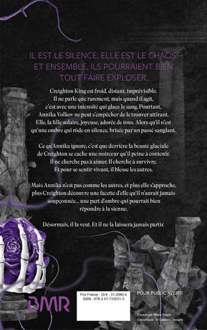 Creighton King est froid, distant, imprévisible. Il ne parle que rarement, mais quand il agit, c’est avec une intensité qui glace le sang. Pourtant, Annika Volkov ne peut s’empêcher de le trouver attirant. Elle, la fille solaire, joyeuse, adorée de tous. Alors qu’il n’est qu’une ombre qui rôde en silence, brisée par un passé sanglant.