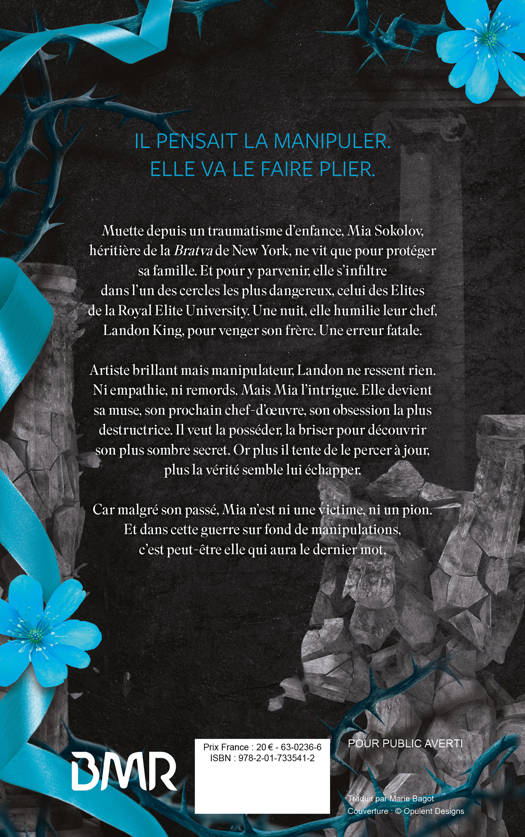Muette depuis un traumatisme d’enfance, Mia Sokolov, héritière de la Bratva de New York, ne vit que pour protéger sa famille. Et pour y parvenir, elle s’infiltre dans l'un des cercles les plus dangereux, celui des Elites de la Royal Elite University. Une nuit, elle humilie leur chef, Landon King, pour venger son frère. Une erreur fatale. Artiste brillant mais manipulateur, Landon ne ressent rien. Ni empathie, ni remords. Mais Mia l'intrigue. Elle devient sa muse, son prochain chef-d’œuvre, son obsession la plus destructrice. Il veut la posséder, la briser pour découvrir son plus sombre secret. Or plus il tente de le percer à jour, plus la vérité semble lui échapper. Car malgré son passé, Mia n’est ni une victime, ni un pion. Et dans cette guerre sur fond de manipulations, c’est peut-être elle qui aura le dernier mot.