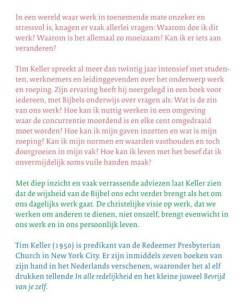 Met diep inzicht en vaak verrassende adviezen laat Keller zien dat de wijsheid van de Bijbel ons echt verder brengt als het om ons dagelijks werk gaat. De christelijke visie op werk, dat we werken om anderen te dienen, niet onszelf, brengt evenwicht in ons werk en in ons persoonlijk leven.
