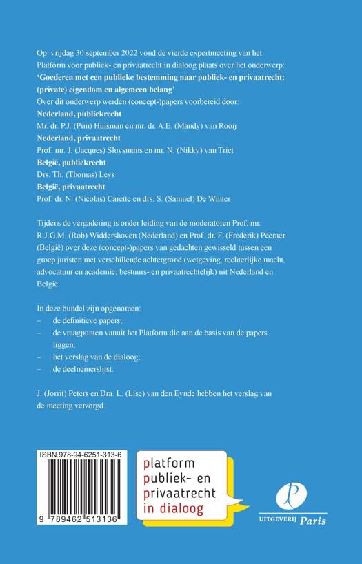 Op vrijdag 30 september 2022 vond de vierde expertmeeting van het Platform voor publiek- en privaatrecht in dialoog plaats over het onderwerp: ‘Goederen met een publieke bestemming naar publiek- en privaatrecht: (private) eigendom en algemeen belang’ Over dit onderwerp werden (concept-)papers voorbereid door: Nederland, publiekrecht Mr. dr. P.J. (Pim) Huisman en mr. dr. A.E. (Mandy) van Rooij Nederland, privaatrecht Prof. mr. J. (Jacques) Sluysmans en mr. N. (Nikky) van Triet België, publiekrecht Drs. Th. (Thomas) Leys België, privaatrecht Prof. dr. N. (Nicolas) Carette en drs. S. (Samuel) De Winter