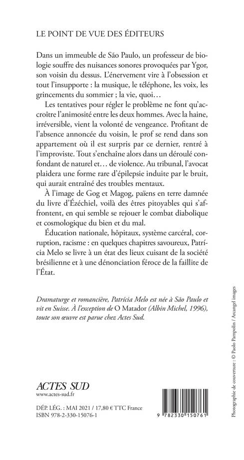 Dans un immeuble de São Paulo, un professeur de biologie souffre des nuisances sonores provoquées par Ygor, son voisin du dessus. L' énervement vire à l'obsession et tout l'insupporte : la musique, le téléphone, les voix, les grincements du sommier ; la vie, quoi... Les tentatives pour régler le problème ne font qu'accroître l'animosité entre les deux hommes. Avec la haine, irréversible, vient la volonté de vengeance. Profitant de l'absence annoncée du voisin, le prof se rend dans son appartement où il est surpris par ce dernier, rentré à l'improviste. Tout s'enchaîne alors dans un déroulé confondant de naturel et... de violence. Au tribunal, l'avocat plaidera une forme rare d'épilepsie induite par le bruit, qui aurait entraîné des troubles mentaux. À l'image de Gog et Magog, païens en terre damnée du livre d'Ézéchiel, voilà des êtres pitoyables qui s'affrontent, en qui semble se rejouer le combat diabolique et cosmologique du bien et du mal. Éducation nationale, hôpitaux, système carcéral, corruption, racisme : en quelques chapitres savoureux, Patrícia Melo se livre à un état des lieux cuisant de la société brésilienne et à une dénonciation féroce de la faillite de l'État.