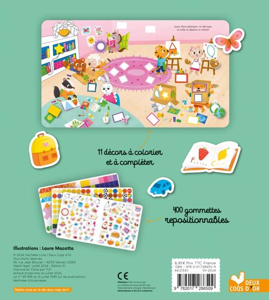 Un cahier de 24 pages sur le thème de l'école maternelle proposant des décors à colorier et compléter avec plus de 400 gommettes repositionnables : des gommettes géométriques unies ou à motifs (ronds, carrés, rectangles, triangles, étoiles...) et des gommettes silhouettées. Dans chaque scène (salle de classe, cour de récré, cantine, préau, etc.), un texte court raconte à l'enfant ce qui s'y passe.