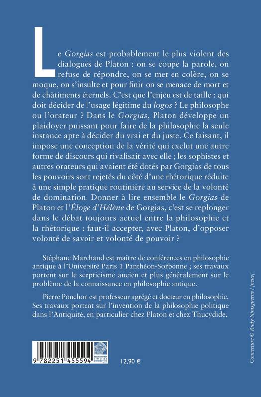 Le Gorgias est probablement le plus violent des dialogues de Platon: on se coupe la parole, on refuse de repondre, on se met en colere, on se moque, on s'insulte et pour finir on se menace de mort et de chatiments eternels. C'est que l'enjeu est de taille: qui doit decider de l'usage legitime du logos ? Le philosophe ou l'orateur ? Dans le Gorgias, Platon developpe un plaidoyer puissant pour faire de la philosophie la seule instance apte a decider du vrai et du juste. Ce faisant, il impose une conception de la verite qui exclut une autre forme de discours qui rivalisait avec elle; les sophistes et autres orateurs qui avaient ete dotes par Gorgias de tous les pouvoirs sont rejetes du cote d'une rhetorique reduite a une simple pratique routiniere au service de la volonte de domination. Donner a lire ensemble le Gorgias de Platon et l'Eloge d'Helene de Gorgias, c'est se replonger dans le debat toujours actuel entre la philosophie et la rhetorique: faut-il accepter, avec Platon, d'opposer volonte de savoir et volonte de pouvoir ? Cette nouvelle edition a ete entierement relue et corrigee par les deux auteurs. La bibliographie a ete mise a jour.